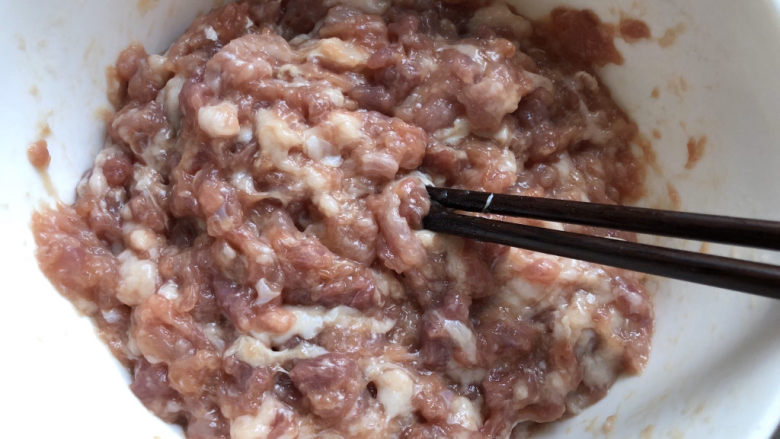 5. 加调味品,分次加入葱姜水到肉糜用筷子搅拌。