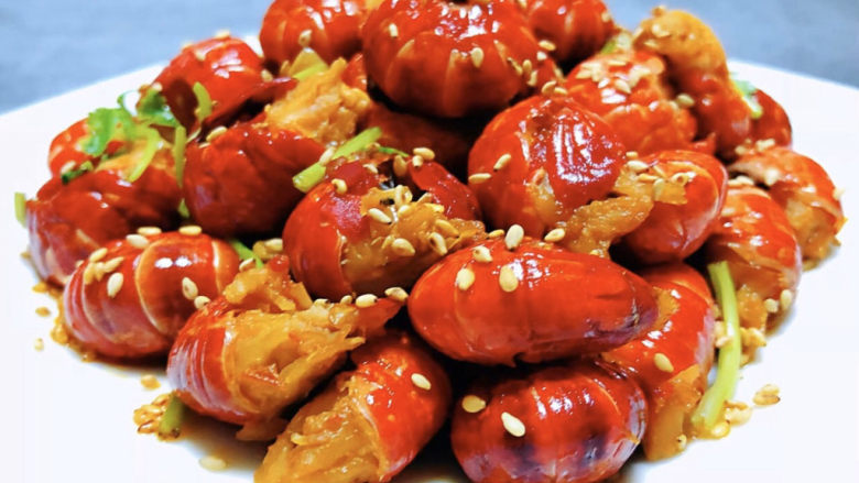 7. 爆炒小龙虾装入盘中撒上芝麻就大功告成了