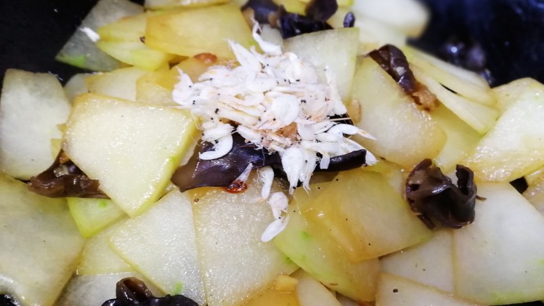 11. 炒到冬瓜开始变透明,放入虾皮炒匀即可。