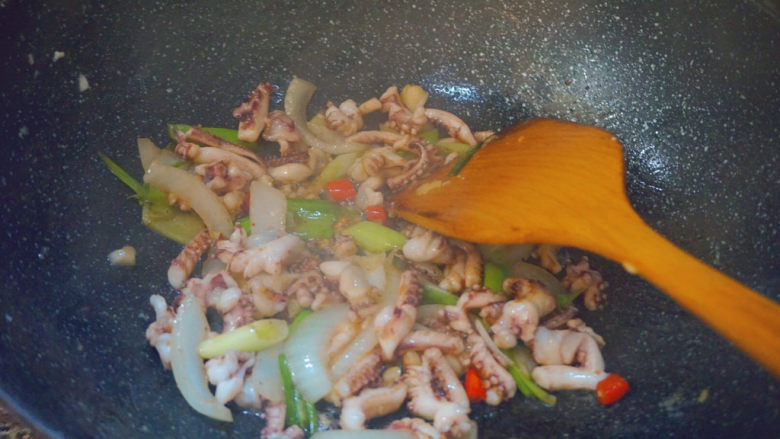 - 鱿鱼要先煮一遍哦,记得放几片姜片和料酒去腥