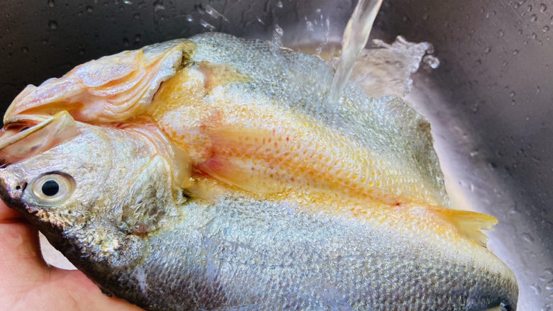 4. 黄鱼背上划三刀,取适量盐涂抹鱼身
