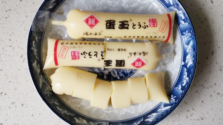 1. 准备日本豆腐切成1.5厘米厚度,要不容易碎