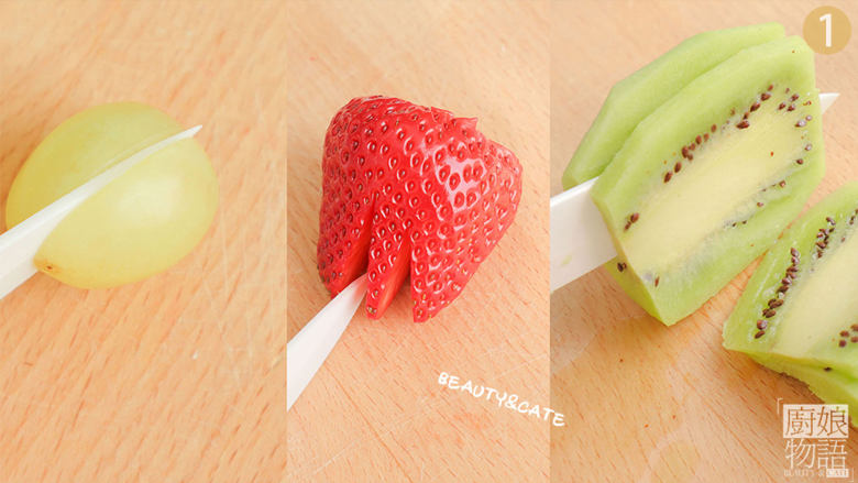 1. 青提对半切开,草莓切两个缺口,猕猴桃去皮切片备用