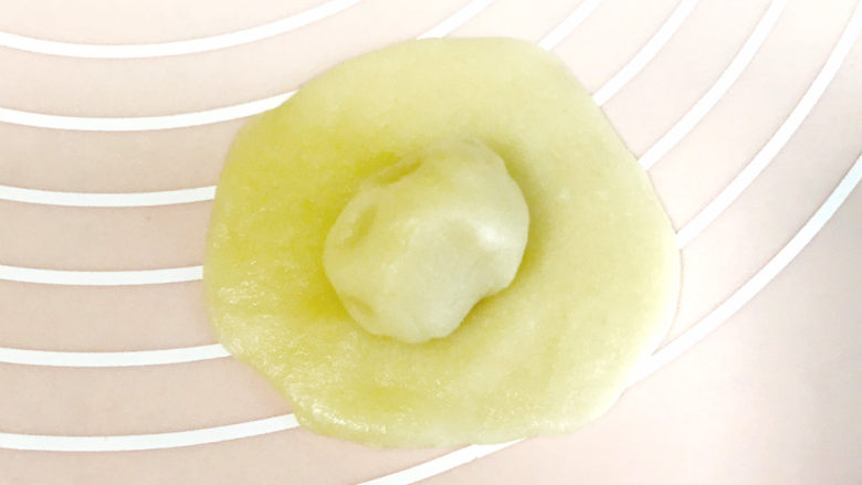 8. 取一个水油皮擀成中间厚四周薄的圆皮,取一个油酥放在圆皮中心