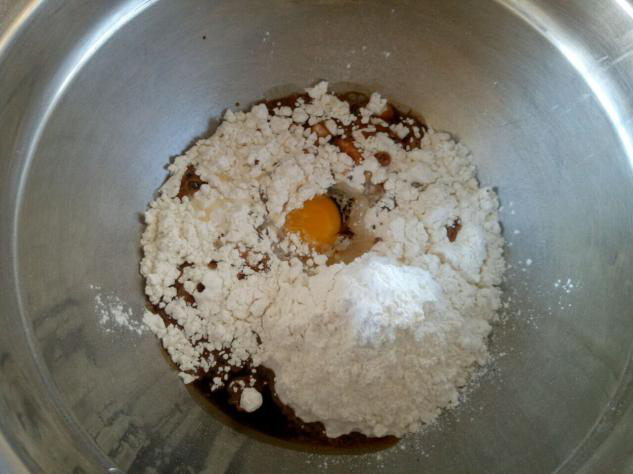 4. 盆里放160克面粉、一个60克左右的鸡蛋,红枣碎,然后倒入红糖酵母水混合。