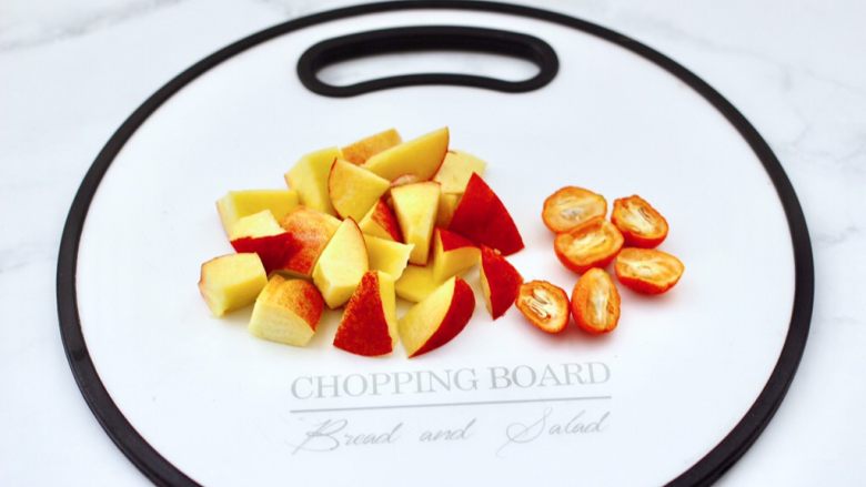 2. 油桃洗净后去核切成小块,金桔对半切开。