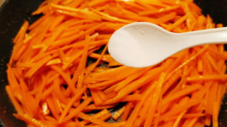 12. 翻炒断生 胡萝卜丝变塌软 放入盐调味