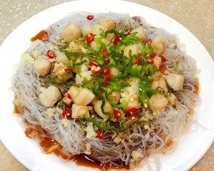 1. 龙口粉丝2把,开水烫软泡五分钟后捞出。 加香油少许将粉丝拌匀,这样蒸好后粉丝就不会坨在一起。