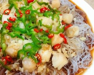 3. 将烫好的粉丝、瑶柱摆盘,撒上切碎的姜蒜末,上锅蒸熟即可。 (时间根据食材耐火程度,一般煮开后约5-10分钟)