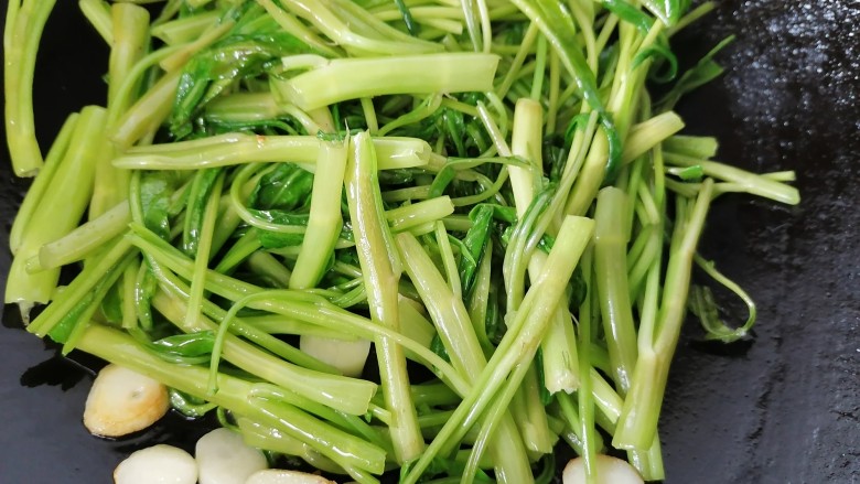 8. 先将空心菜根部放入锅内翻炒