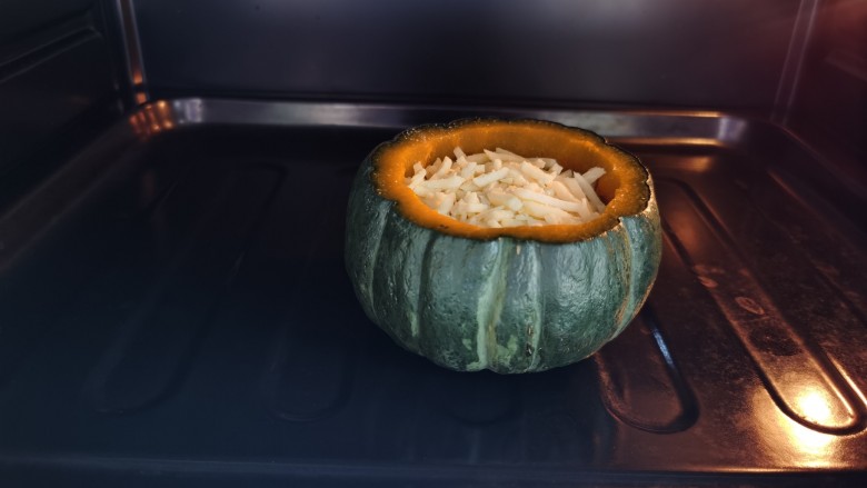 13. 放入烤箱上下火200℃烤约15—20分钟。烤制时间根据南瓜大小和烤箱温度决定。