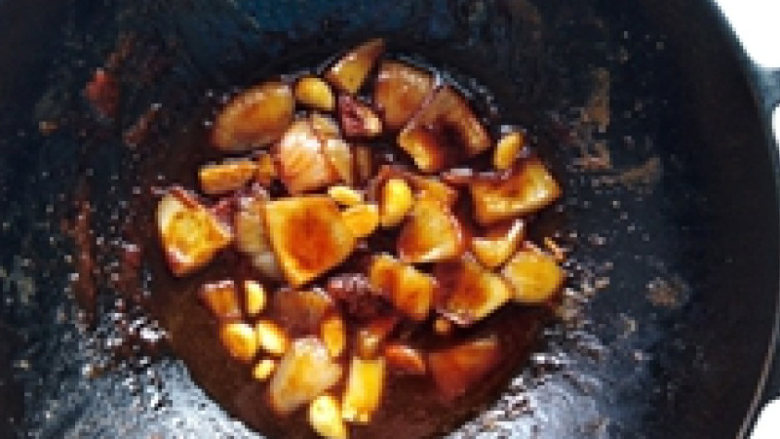 7. 再加少许的油下入洋葱,蒜头炒几分钟