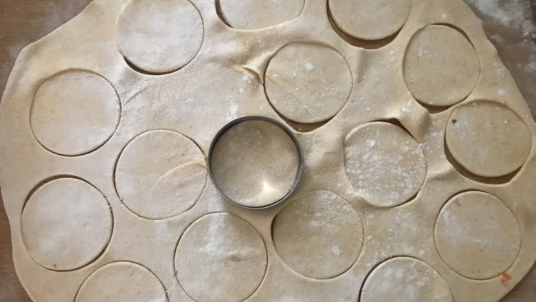 12. 面醒好后,再揉几下,直接擀成薄片,用圆形 模具压出饺子皮