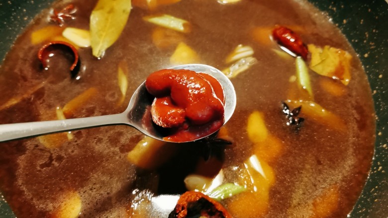 9. 放入甜面酱增加酱香味 并加入适量清水
