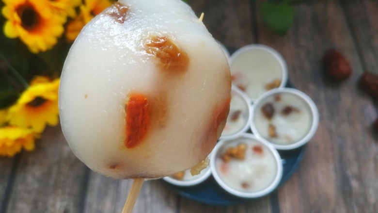 10. 把模具放入屉中,加入葡萄干,枸杞子,红枣碎