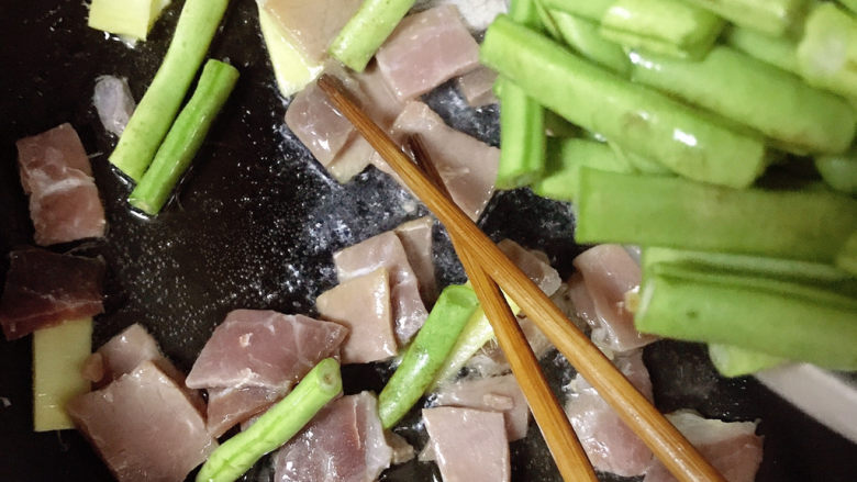 6. 放入火腿片翻炒2分钟,炒出香味