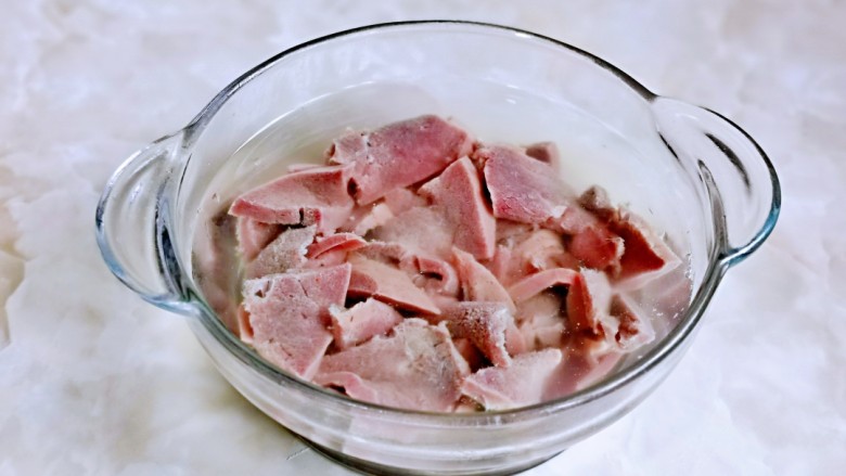 8. 猪肝焯水,锅中水烧开后处理好的下猪肝,再次烧开捞出冲冷水,淋干水分备用。