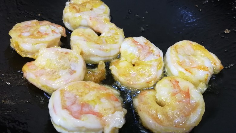 13. 热锅倒入适量油,油温4成热放入虾仁。