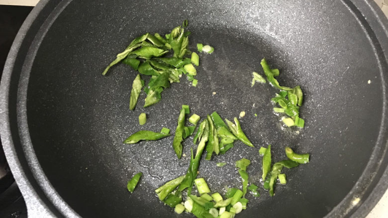 14. 锅里再加少许食用油,放入葱花和青椒丝翻炒;