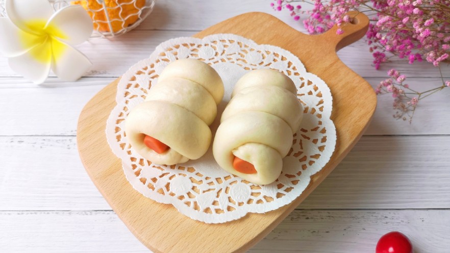 10. 取半根火腿肠,将卷好的长条状面团缠绕在火腿肠上面,一个香肠馒头卷就做好了,依次做完剩下的馒头卷。