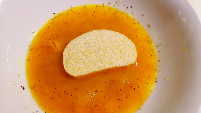 5. 将馒头片放入调好的蛋液中 两面均匀蘸上蛋液。