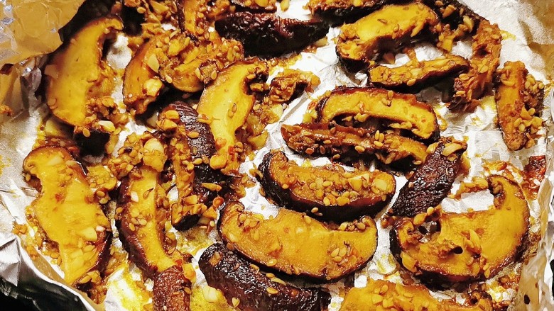 15. 装盘撒上白芝麻点缀,香味浓郁的孜然烤香菇完成。