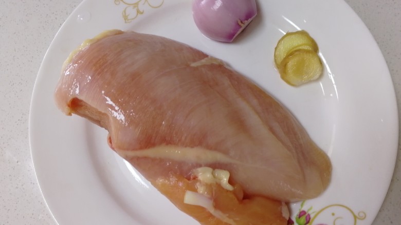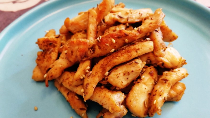 14. 把煎软的圆葱推到锅边,逐条放上鸡胸肉。