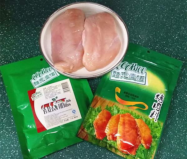 2. 鸡胸肉洗净沥干水分,用刀一片为二