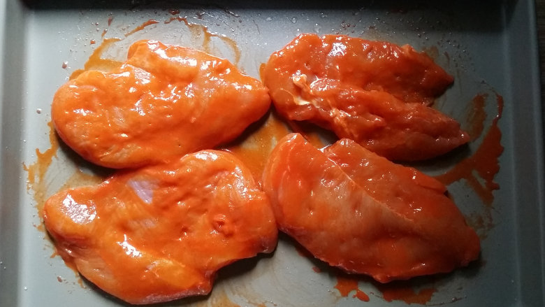 8. 腌好后,用钢针在鸡胸肉上多扎些小孔,便于烤制时候入味