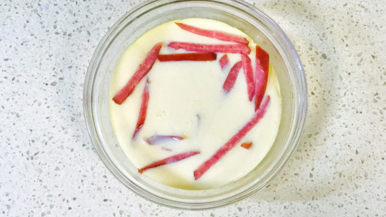 15. 一直煮至鸡蛋液八成凝固时,将剩下的香肠丝加入鸡蛋液表面