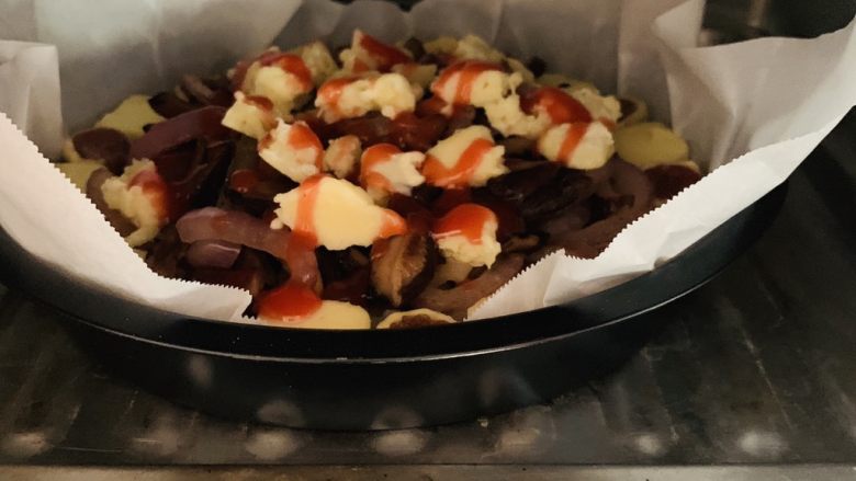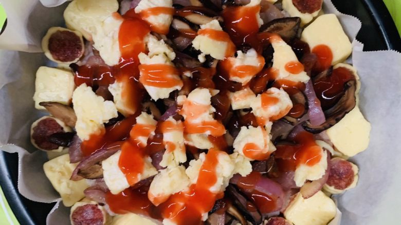 45. 饼底外圈间隔铺上芝士块和腊肠块。