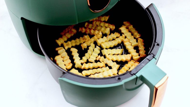 9. 空气炸锅提前200度预热5分钟后,把抹好的土豆条放入炸篮里。