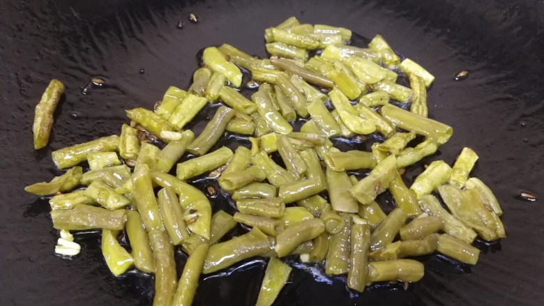 9. 放入酸豆角,文火翻炒均匀。