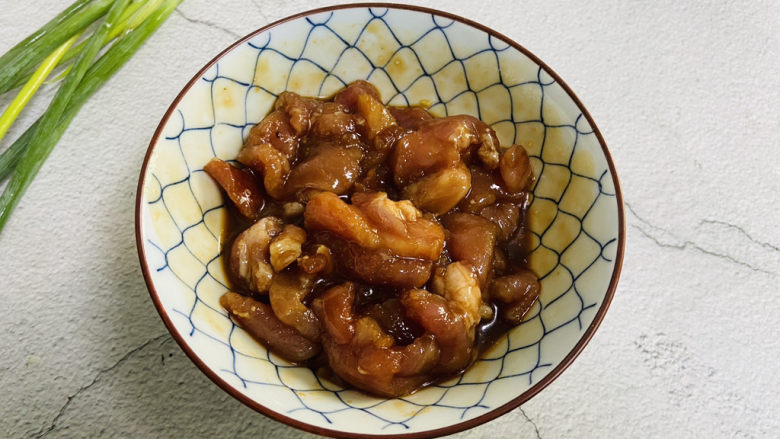 8. 倒入腌制后的瘦肉片