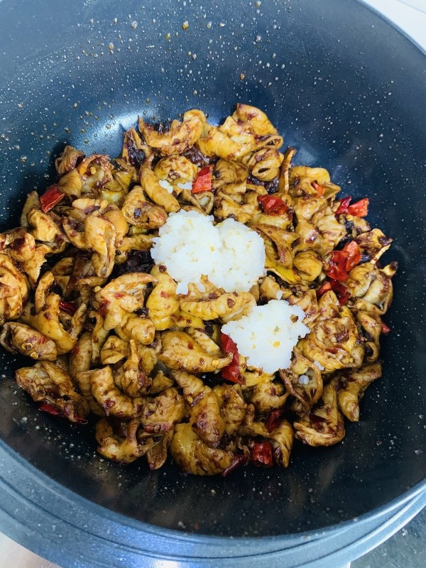 8. 下猪大肠,豆瓣酱,麻辣酱,干辣椒,翻炒均匀