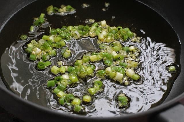 5. 锅中倒适量食用油烧至五成热,放入葱花和姜末小火炒出香味。