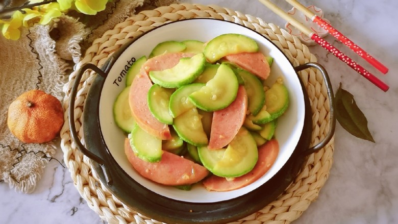 做火腿面包剩下了一段火腿,和小西葫炒一炒,当做午餐便当配菜 清香美味。