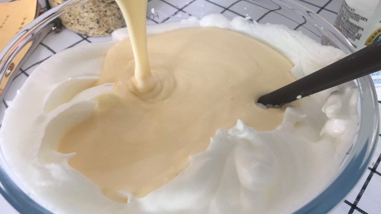 3. 取三分之一的蛋白霜到蛋黄糊里面。