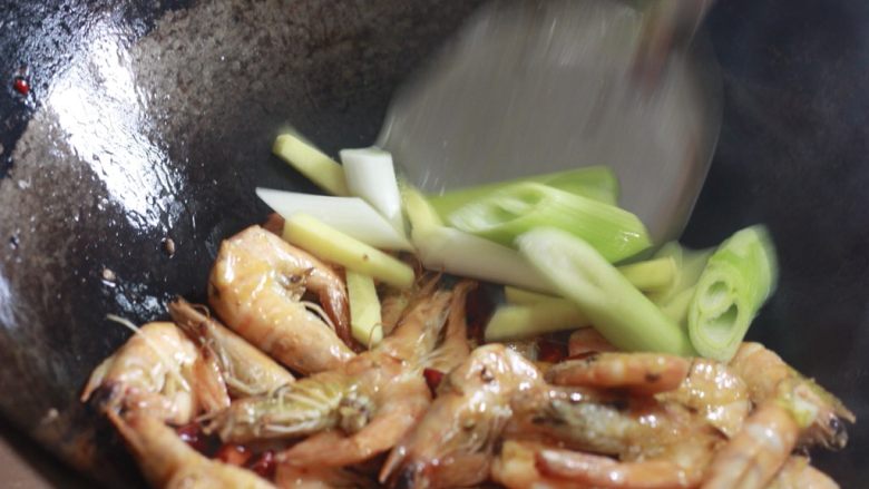 4. 热锅冷油,虾入锅,可沿锅边滑入防止溅油