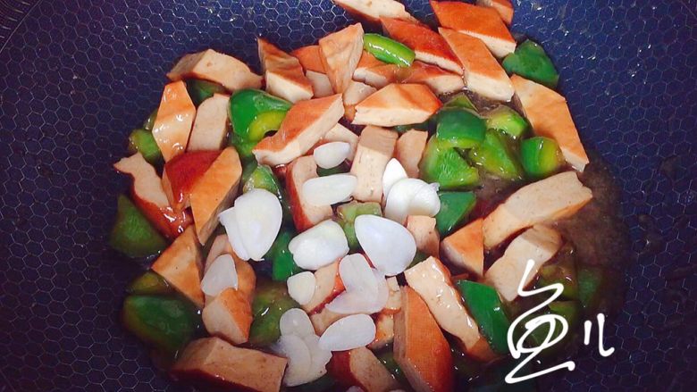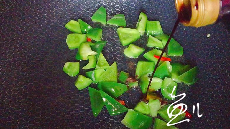7. 油锅烧热,放入小米椒和青椒翻炒片刻