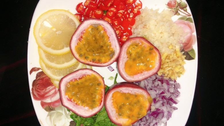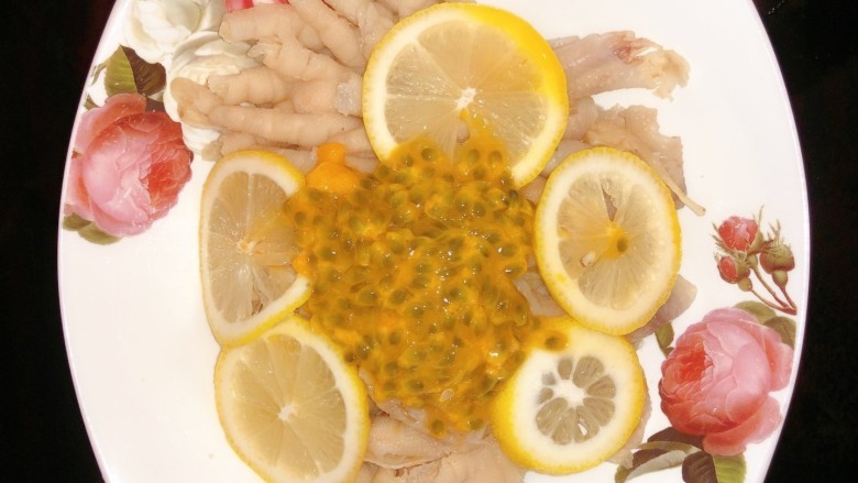 9. 鸡爪放入盘里,加入百香果和柠檬片