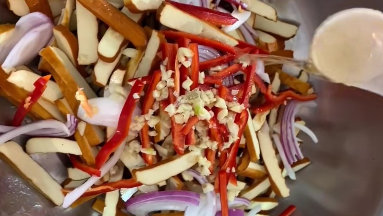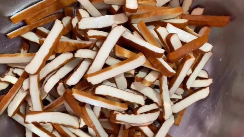 1. 香干从包装中取出切成条。