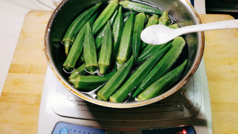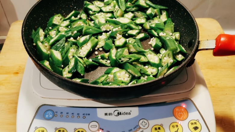 12. 锅中留下底油 继续加热 放入秋葵翻炒。