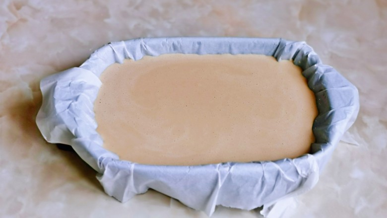 8. 器具中垫好油纸,再倒入红糖奶糊。