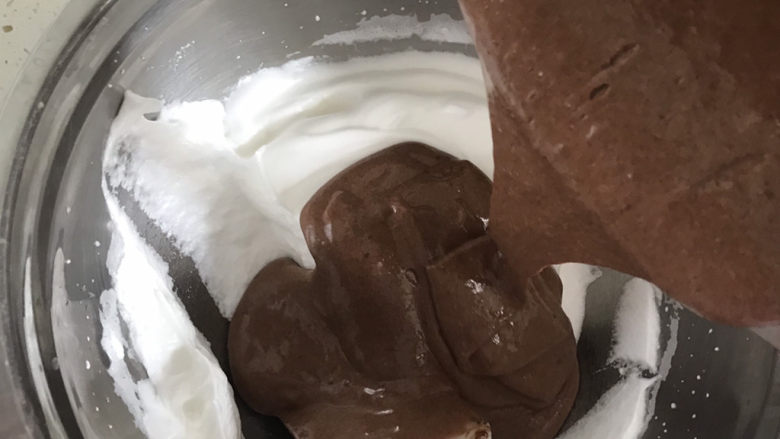 14. 翻拌好的蛋黄糊再全部倒入蛋白霜中,同样的手法翻拌均匀