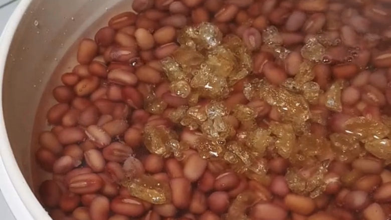 3. 加入冰糖,可以根据自己喜欢的甜度来增减,盖上盖小火焖30分钟,关火,一会再煮开,再焖15分钟。也可以选择用电饭煲,不过不方便查看豆子的情况