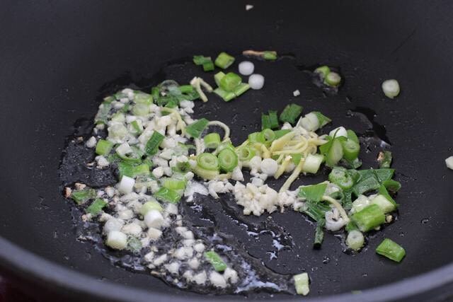 6. 倒掉煎蟹子所剩的食用油,重新倒油烧至五成热,放入葱姜蒜小火炒出香味。