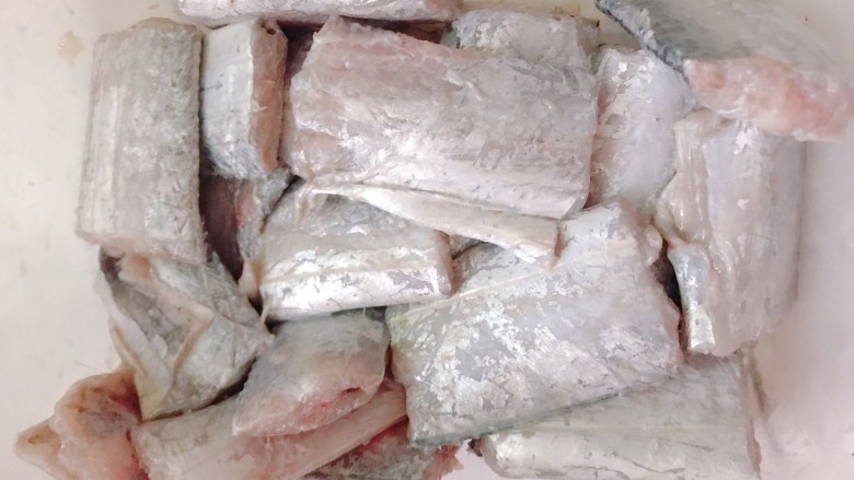 8. 抖去多余淀粉,带鱼段放在盘子里