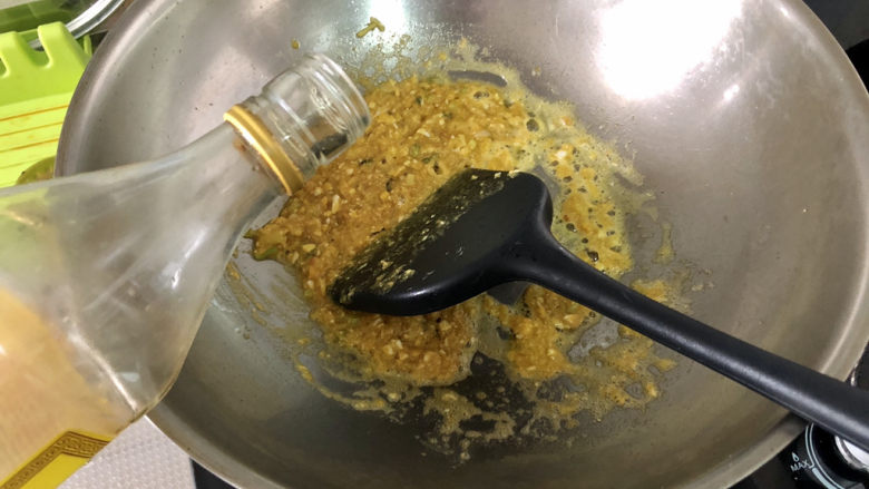 14. 淋一茶匙料酒或黄酒,继续滑炒,起大沫