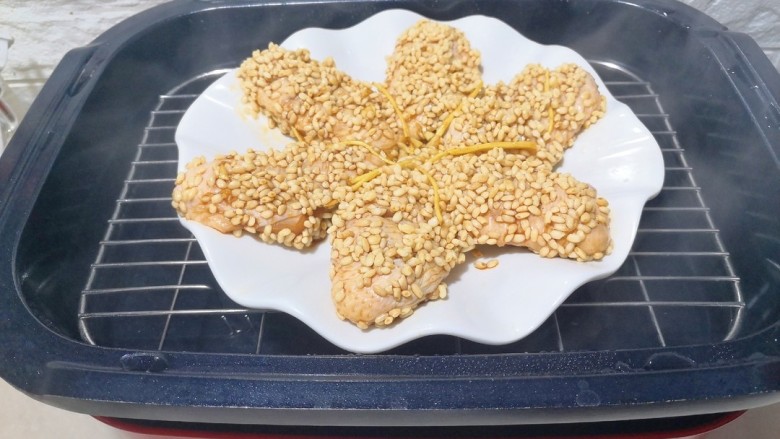 8. 将沾上糯米的鸡翅中摆好,美食锅下水,水开放入糯米鸡翅